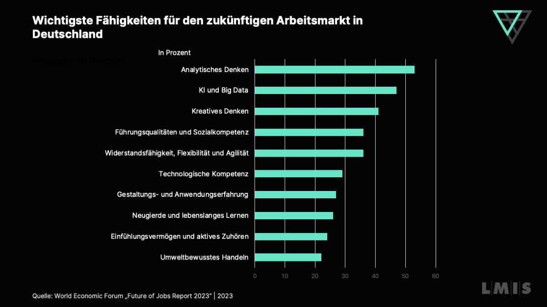 Um die Mitarbeiter fit für die Zukunft zu machen, ist eine gezielte Weiterbildung unerlässlich. Führungskräfte sollten dafür sorgen, dass ihre Mitarbeiter die notwendigen Kenntnisse und Fähigkeiten erwerben, um mit KI-Systemen umgehen zu können. Laut einer Studie des Weltwirtschaftsforums von 2023 werden Fähigkeiten wie analytisches Denken (53 Prozent) sowie KI und Big Data (47 Prozent) in den Augen vieler Unternehmen an Bedeutung gewinnen. Weiterbildungen in diesen Bereichen sind daher sinnvoll.