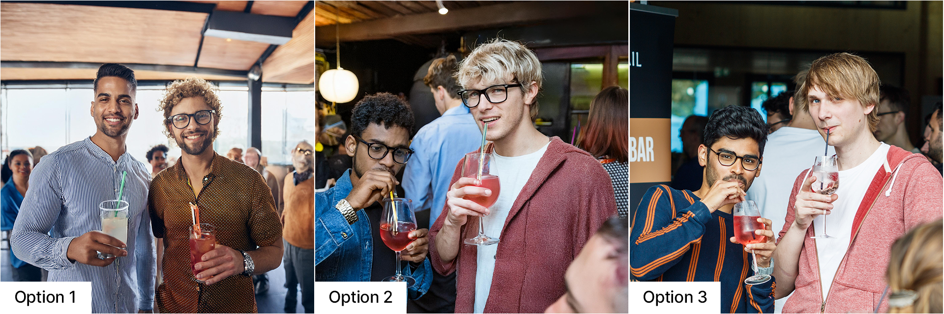In unserem dritten Versuch stellten wir die KI vor den ultimativen Test: Wir wollten sehen, wie sie mit Bildern von Menschen umgeht. Dafür haben wir uns ein Foto unseres letzten Sommerfestes ausgesucht. Hier sind unsere Mitarbeiter Yash und Daniel zu sehen, die das Cocktail-Angebot genießen. Der Prompt für die KI-generierten Bilder war diesmal ein bisschen weniger detailliert und lautete: