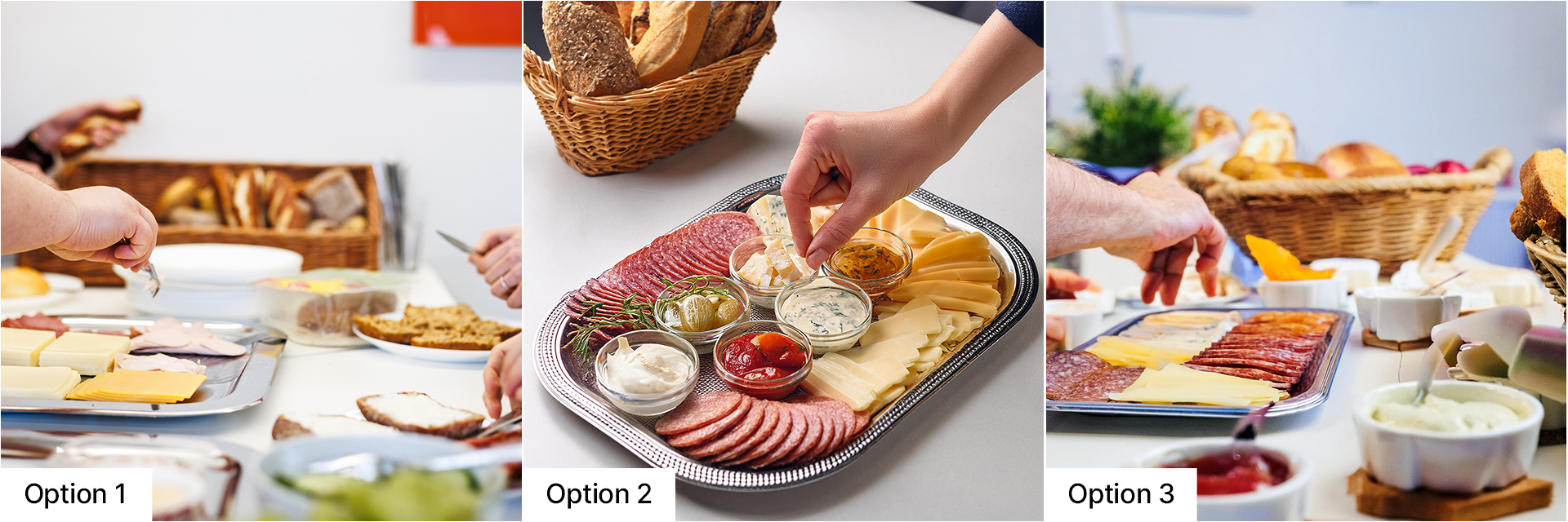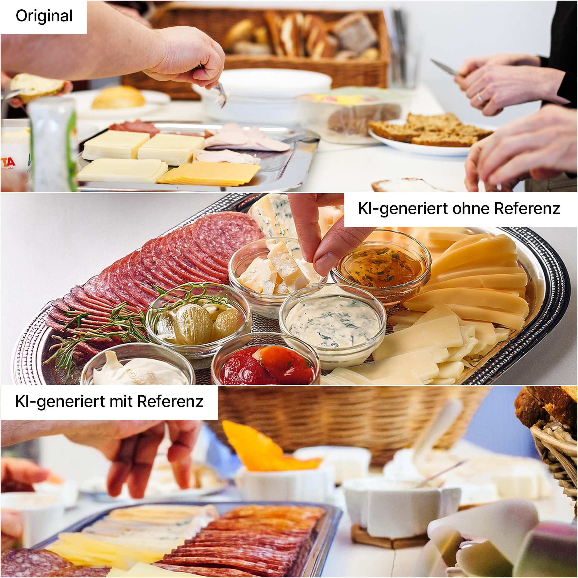 Jeden Mittwoch findet unser internes Frühstück statt. Wir wollten herausfinden, wie gut die KI mit Gegenständen umgehen kann. Dazu eignet sich unser Frühstück sehr gut, dachten wir. Den Prompt, also den Befehl, den wir der KI für die generierten Bilder gegeben haben, haben wir auf Basis des Originalfotos erstellt. Dabei haben wir versucht, so genau wie möglich zu beschreiben, was zu sehen ist. Der Prompt lautete: