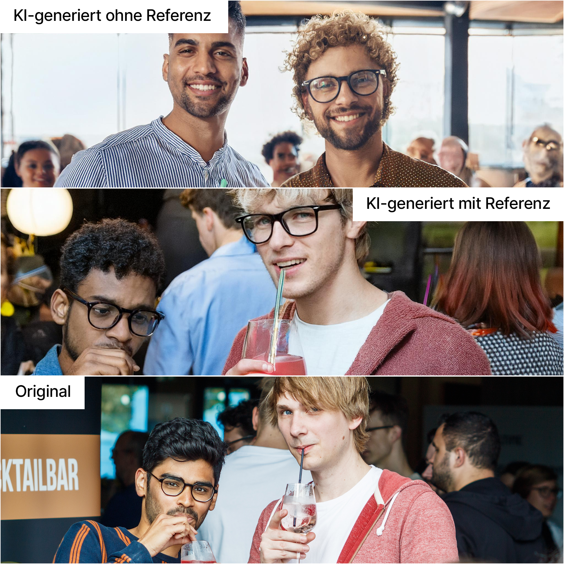 Die KI-Anwendung Firefly von Adobe ist hier anderen Tools deutlich überlegen. Bereiche, mit denen Programme sonst oft Schwierigkeiten haben, wie die Augen oder die Mundpartie, sind hier gut und realistisch umgesetzt – zumindest bei den beiden Menschen im Fokus. Wenn man genau hinschaut, sieht man auf dem Bild ohne Referenz rechts im Hintergrund eine Person, die kein wirkliches Gesicht hat. Beide KI-generierten Bilder kommen damit durcheinander, welche Person eine Brille tragen soll. Ansonsten ist das Referenzbild dem anderen KI-generierten Bild überlegen. Die Stimmung entspricht viel mehr dem Original und auch die Anweisungen bezüglich der beiden Personen wurden umgesetzt.