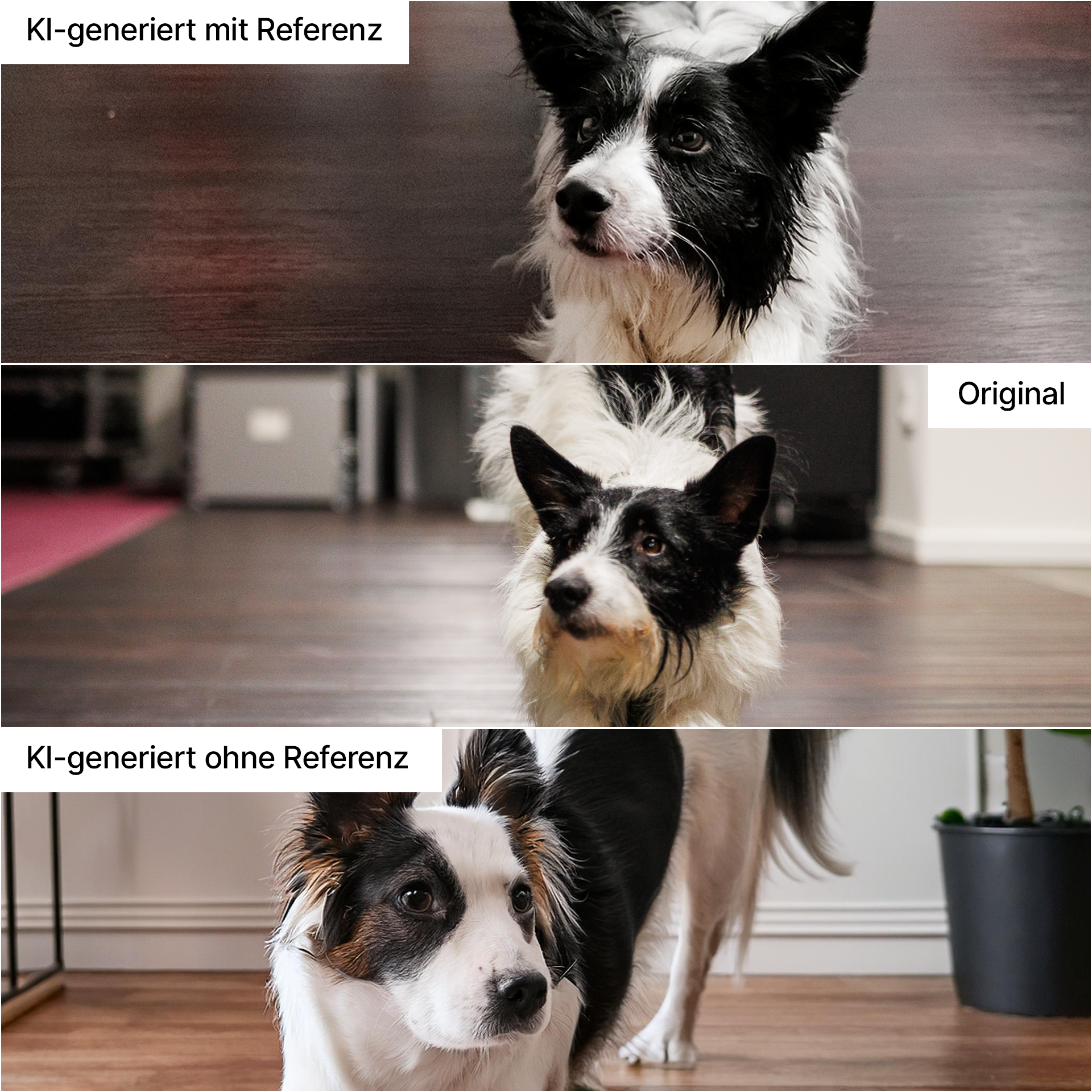 Hier zeigt sich, dass die KI ohne Referenz bei KI-generierten Bildern an ihre Grenzen stößt. Während das Bild mit dem Original als Vorlage ein recht getreues Abbild dessen ist, was wir vorgegeben haben, ist das Bild ohne Referenz sehr unrealistisch. Der Hund ist unproportioniert, sein Körper ist zu lang und es sieht eher so aus, als hätte man einen sich streckenden Hund an einen liegenden Hund angehängt. Mit Referenzbild sieht das KI-Bild dem Original jedoch sehr ähnlich. Die Farbe von Topsis Fell wurde leicht verändert, und sein Fell ist vor allem an den Vorderbeinen länger. Auch der Hintergrund wurde leicht verändert. Auf jeden Fall ein sehr realistisches Ergebnis.